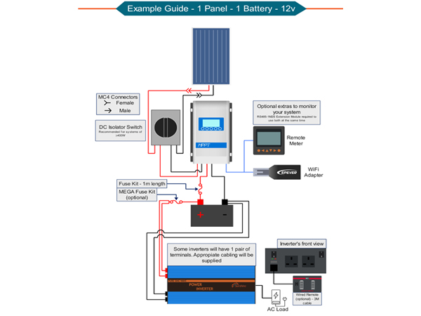 The 450W Off Grid Solar Kit comes complete with all the essential cables, switches and an AGM battery.